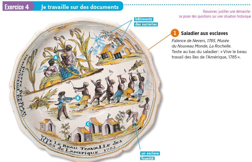 Ce document est un saladier qui représente des esclaves africains dans une plantation de canne à sucre dans les Antilles.