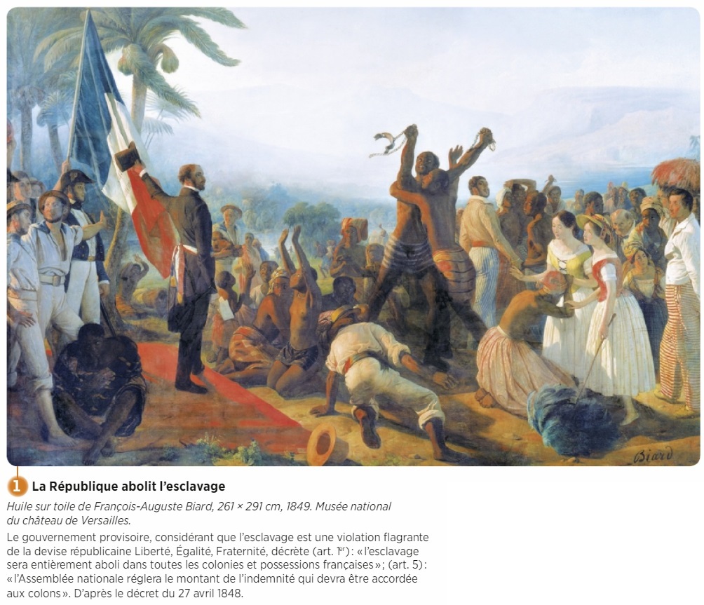 13. D'après cette peinture, l'abolition de l'esclavage fut décidée par la République et tout s'est bien déroulé : à votre avis, est-ce vrai ? Justifiez votre réponse.